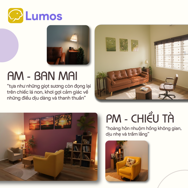 - AM (ban mai): mang sắc màu chủ đạo xanh lơ, tựa như những giọt sương còn đọng lại trên chiếc lá non, khơi gợi cảm giác về những điều dịu dàng và thanh thuần. Ánh sáng rõ ràng, sáng sủa, giúp khơi mở, nhận diện và đối thoại. Đây là không gian dành cho những cuộc trò chuyện tỉnh thức, nơi thân chủ có thể nhìn thấy vấn đề của mình một cách đa tầng sâu sắc.