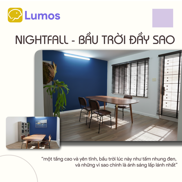 Phòng làm việc Nightfall, một tầng cao và yên tĩnh, bầu trời lúc này như tấm nhung đen, và những vì sao chính là ánh sáng lấp lánh nhất. Những tia sáng bé nhỏ ấy tựa như hy vọng của con người, le lói, trường tồn, chẳng bao giờ mất đi. Đó cũng chính là tinh thần của những người đang công tác và làm việc tại Lumos, luôn mang trong mình sự chân thành và đầy hy vọng có thể đem lại những giá trị tốt đẹp cho cuộc đời.